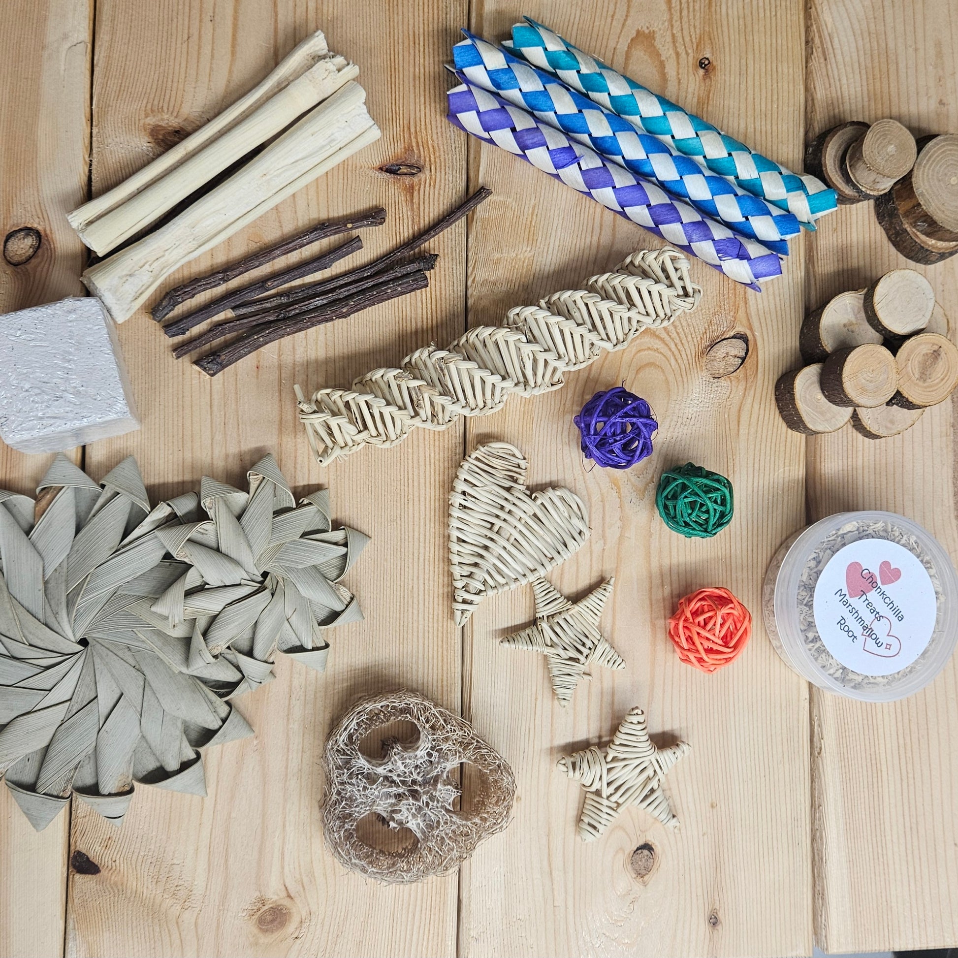 Unleash the full potential of your chinchilla's dental health and happiness with this chew box. With a large variety of treats and chews, this box provides both enrichment and entertainment for your furry friend. Keep your chinchilla satisfied with our fullest box yet!